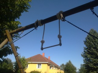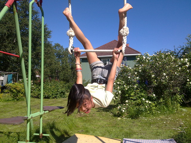 Uansett, fikk plutselig en telefon for noen dager siden om at de hadde fått en pause fra oppussing og ville ha besøk, og at jeg kunne troppe opp allerede neste dag, og da var det bare å hive seg rundt og pakke. Glemte å ta med klatreutstyr, men fikk med meg den kjære trapesen min, og det ble til at vi fikk hengt den opp i et gammelt forlatt dissestativ utenfor den gamle leiligheten til mormor. Var ikke akkurat optimale forhold med mindre enn to meter å gå på, men nok til at vi fikk hatt det kjempegøy en god stund. Har en del å lære vekk i trapes etter et år på «sirkus», selv om trapesen egentlig er for stor til kussen så det var noen figurer hun ikke fikk til, men hun er til gjengjeld langt bedre enn meg i turn og stretching, så vi fikk lært av hverandre. Skulle ønske jeg var myk 11-åring igjen…