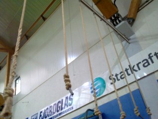 Det beste med klatrehallen er dog disse, for jeg simpelthen elsker å trene luftakrobatikk! Det er kjempegøy og super fysisk trening, og jeg prøver å ta med håndboka mi hver gang jeg er på klatrehallen, selv om gymtauene deres gjør en del mer vondt enn de polstrede repene sirkusskolene bruker. Sirkustau er også mye lenger, og går helt ned til gulvet, mens disse slutter i knuter en god halvmeter over tjukkasen, og bare går noen meter opp. Men jeg storkoser meg 🙂!