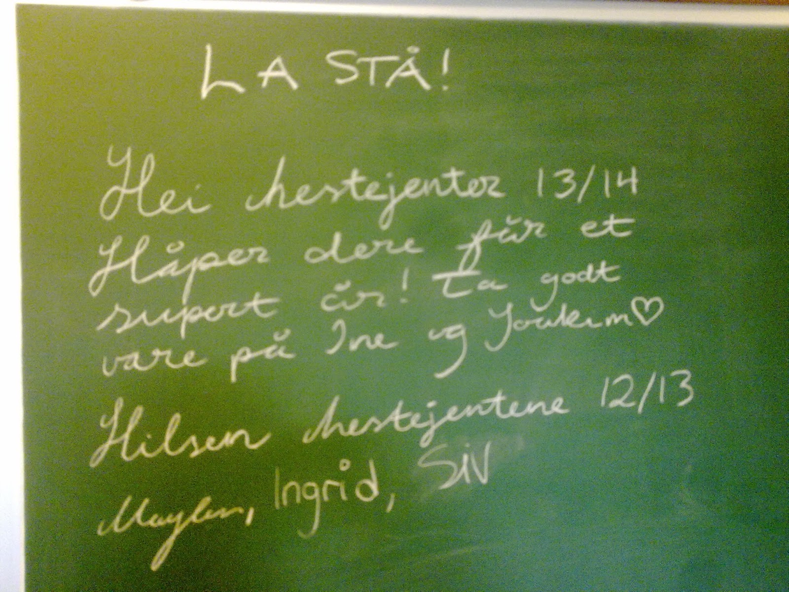 Er òg glad for at jeg er havnet et sted der hestefolkene på gården bryr seg så mye om arbeidet sitt og hestene sine. De er smilende og pedagogiske og hestene og de andre dyrene har det alltid rent og fint. Er en stor overgang å gå fra voltige, der man omtrent ikke bruker noe utstyr, til «vanlig» riding der man plutselig må forholde seg til mye mer utstyr både til deg selv og hesten, men kommer nok inn i det etter hvert.
