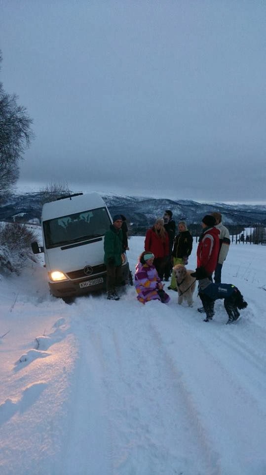 Etter å ha brukt sikkert godt over et kvarter-tjue minutter på å grave snø og dytte buss om hverandre, fikk vi endelig bussen løs sånn at den kunne prøve på en dårlig gjennomtenkt snumanøver og kjøre seg fast igjen. Etter en ny omgang dytting og måking fikk vi kjøretøyet løst igjen, begikk vi oss til fots tilbake mot sivilisasjonen, med bussen ryggende bak. Den kom seg nesten helt frem før den kjørte i grøfta og ble stående og tippe faretruende så vi ikke torde flytte på den, og der sto vi i en time til vi fikk traktorhjelp til å dra bussen fri.