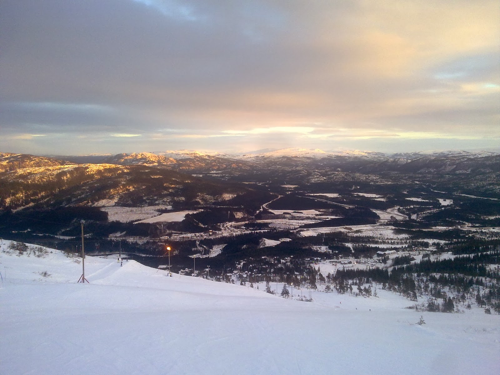 Har vært på skidag med klassen, og kost meg på slalåmski fra 10 til 14. Holdt sammen med en god venn stort sette hele dagen, og fikk med oss både soloppgangen i halv elleve-tiden og solnedgangen i ett-tiden på vei opp skiheisen😉. Heisen gikk helt opp til toppen av fjellet, så vidt jeg kunne se, og derfra hadde vi en nydelig utsikt utover dalen under oss. Var tjukt kledd, og kjente faktisk omtrent ikke kulda i det hele tatt, bortsett fra en liten glipe mellom slalåmbriller og buff. Akkurat her var det til gjengjeld veldig kaldt, og det blåste godt oppe på toppen, så det ble å skynde seg nedover igjen.