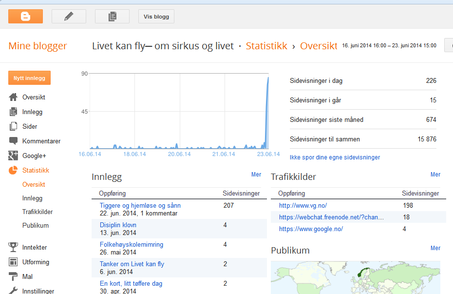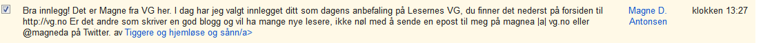 Ikke aner jeg hvordan Magne fant den lille bloggen min i alt mylderet, men ganske riktig, innlegget lå ute på vg.no, og blant andre innlegg med rundt 4-10 treff har innlegget i skrivende stund oppunder halvannet tusen tusen treff, mer enn hva hele bloggen vanligvis får på flere måneder. Vet det selvfølgelig kommer til å avta, og er glad så mange har vært innom, og kanskje jeg får en ny leser eller to, men ja, var temmelig overveldende, for å si det mildt.