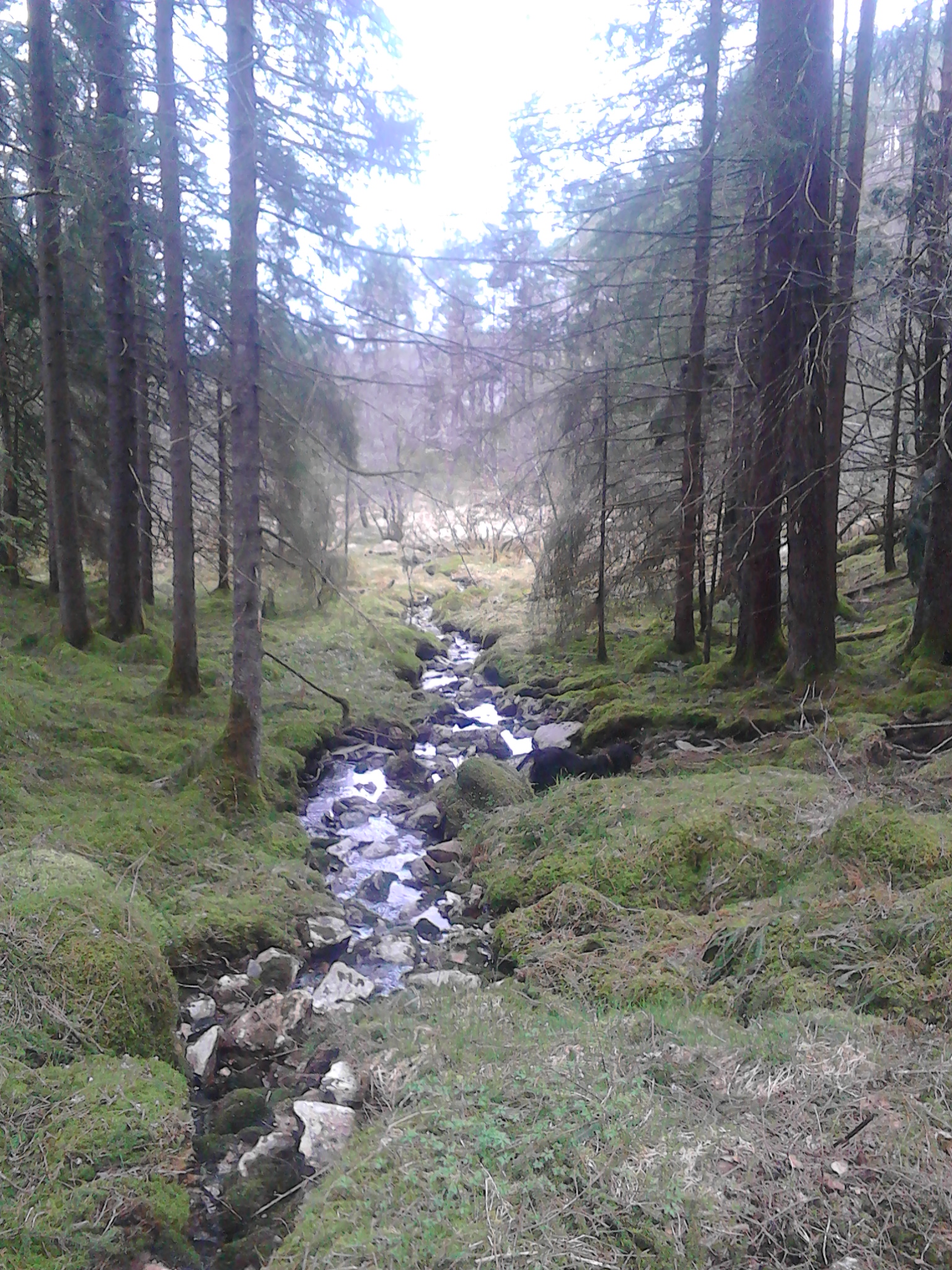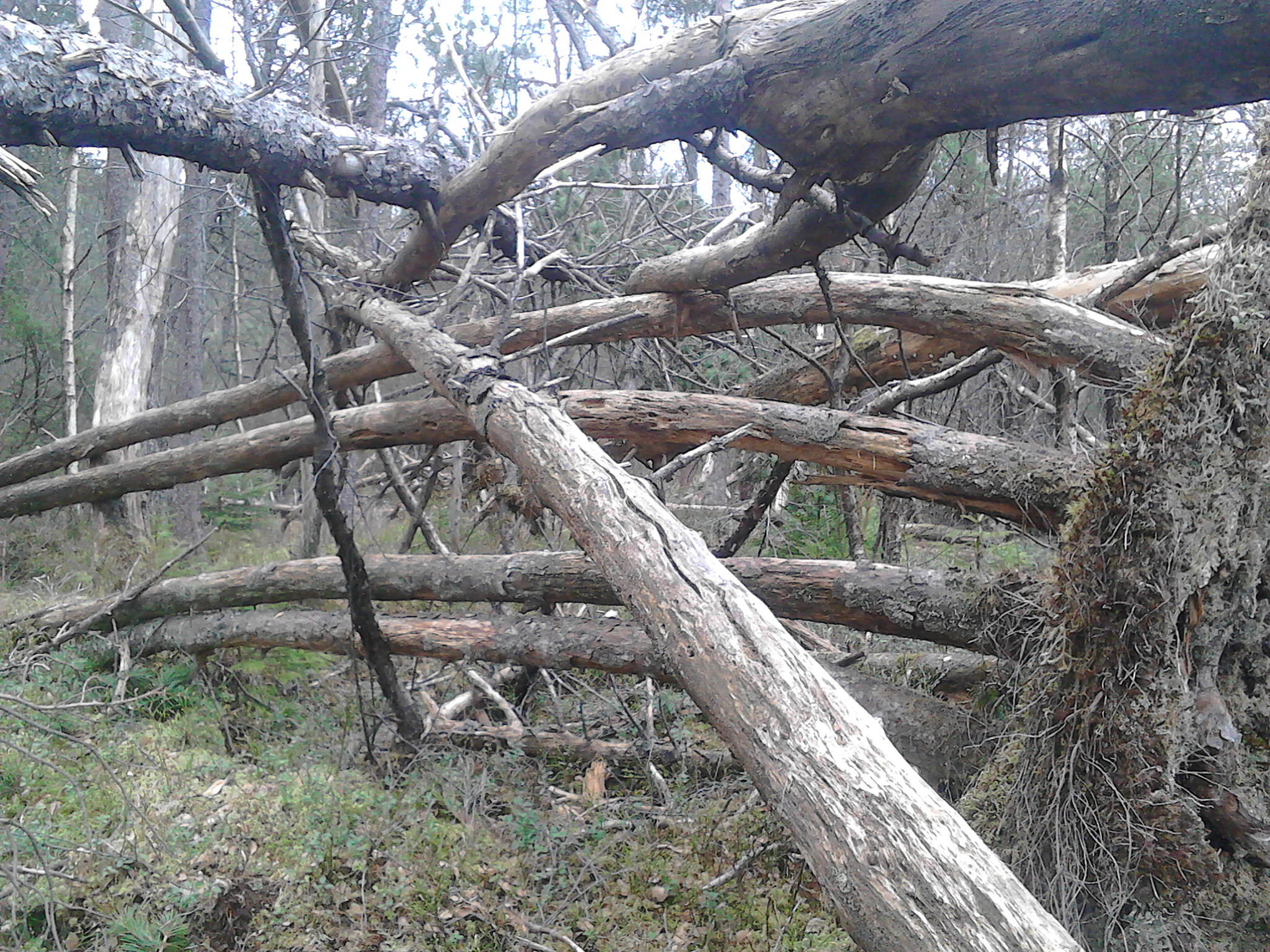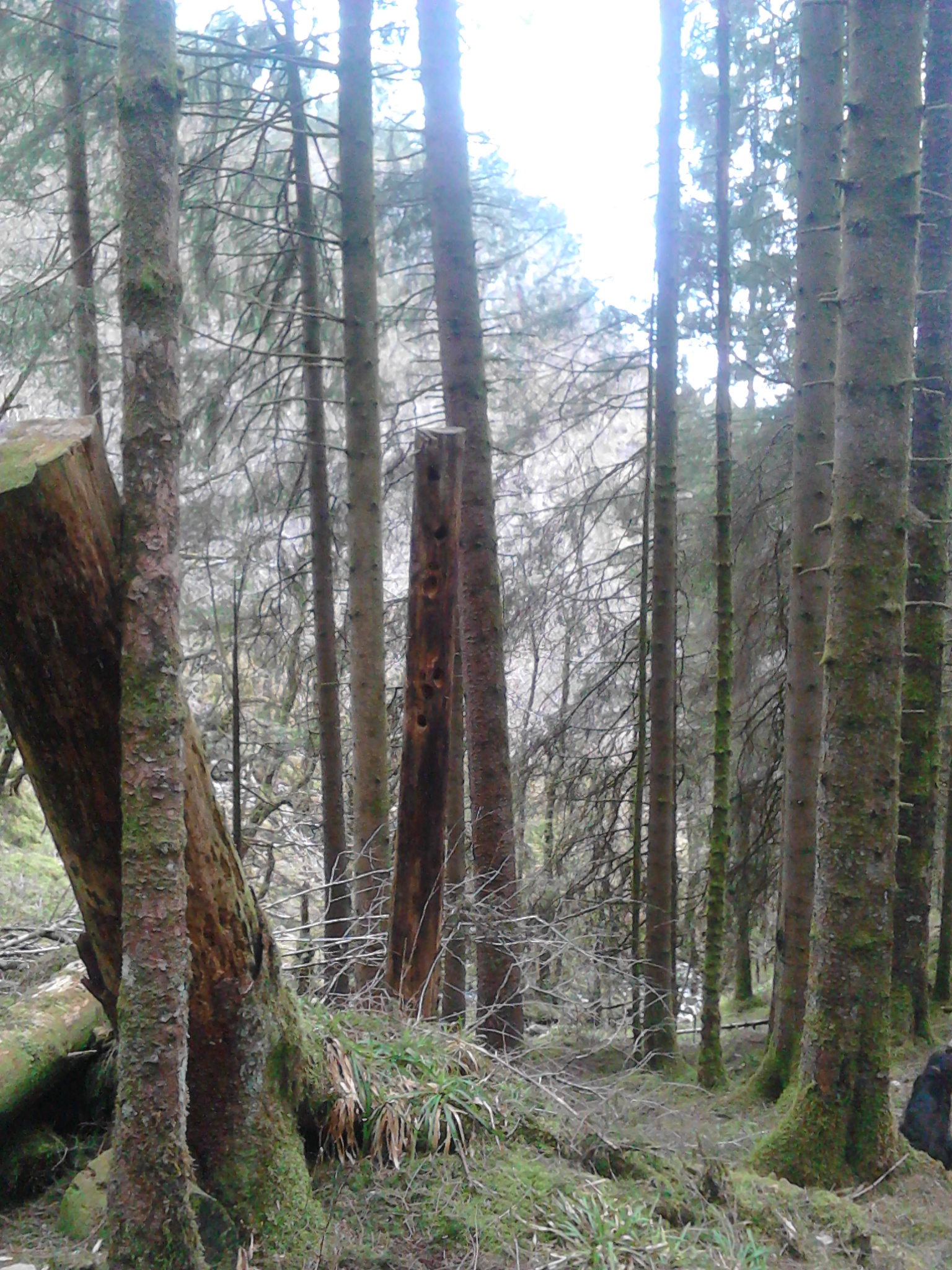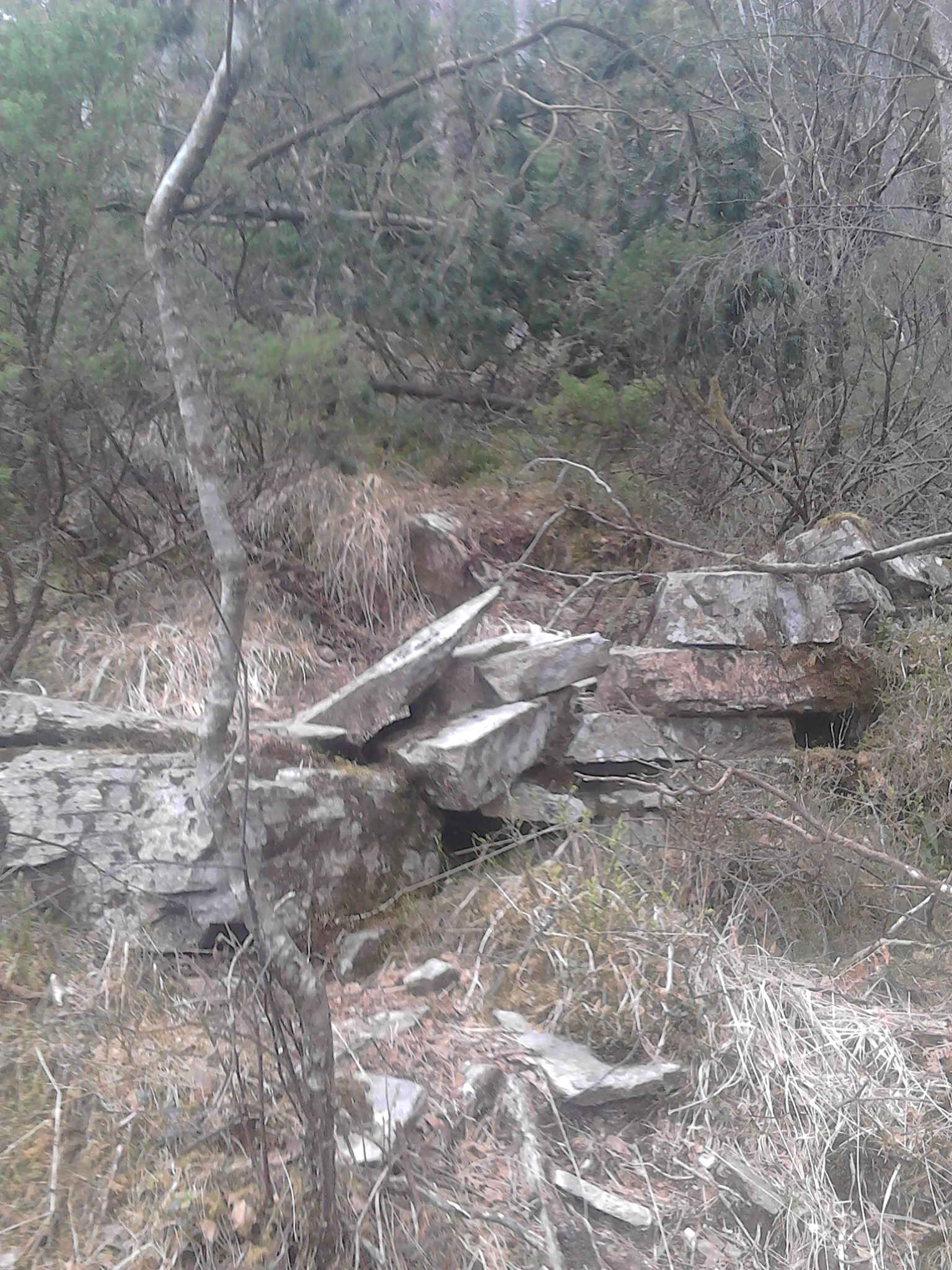 I dag gikk vi nær foten av en liten klippe, langs en bekk som sildret gjennom en lysning i skogen. Rett før jeg bestemte meg for å dra hjem igjen, fant jeg en vei opp den bratte fjellsiden. Et lite stykke opp kom vi over restene etter en lav steinmur, og det gikk en sti oppover, langs kanten av stupet. Stien varte bare et lite stykke, og videre innover sto tynne, døde trær tett. Gikk oppover en bratt skråning, og kom til slutt til et slags platå hvor det var en hel masse veltede trær.