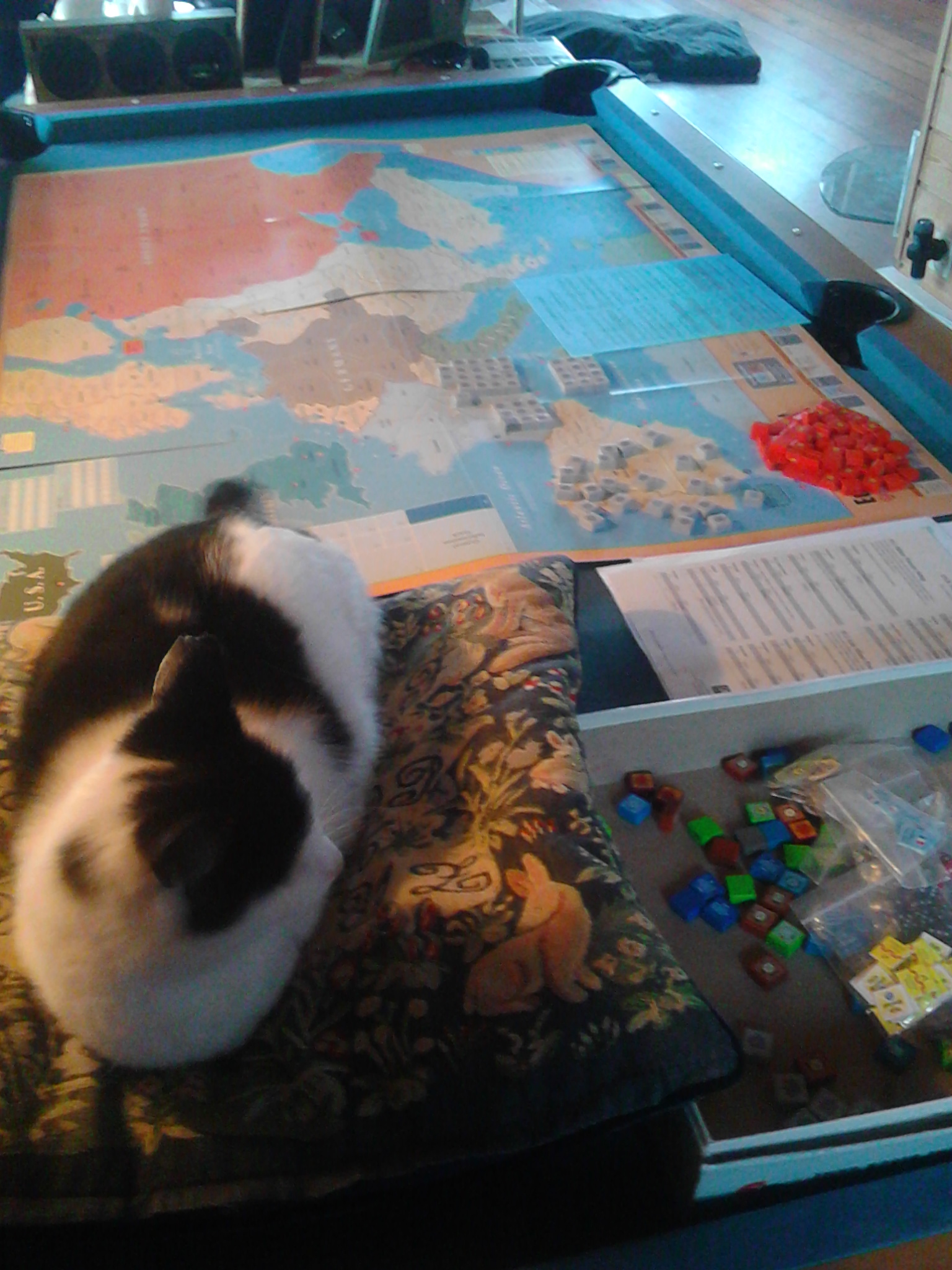 Katten Mio la sin elsk på spillet for lenge siden, men det er først nå vi tobeinte virkelig kom inn i det, og det viste seg at når vi ga det en sjanse, på tross av en veldig kronglete regelbok, var det faktisk utrolig gøy, og vi spilte til lillebror måtte løpe til bussen hjem til Trondheim, rett etter at jeg hadde omringet den tyske hæren i Stalingrad :).