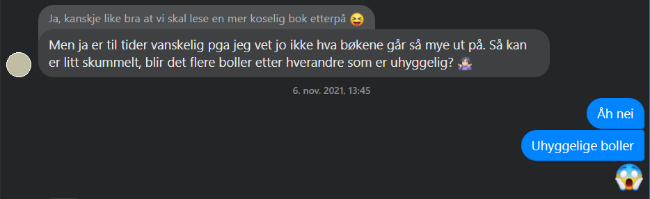 Det jevner seg heldigvis ut, så det ikke blir for mange uhyggelige boller på rad. Og apropos å jevne ut så det blir også gjerne ett eller flere innlegg med anbefalinger av de fine, koselige bøkene. Kanskje «Bøker du kan kose deg med i høstmørket». Det hadde passet denne årstiden fint.