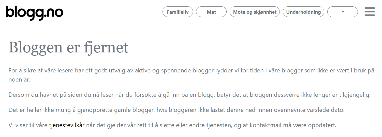 Som jeg har skrevet om tidligere liker jeg å besøke gamle blogger, de fleste av dem fra «storhetstiden» da «alle» hadde sin egen blogg. Gikk inn på en blogg jeg hadde bokmerket, og ble møtt av denne beskjeden —